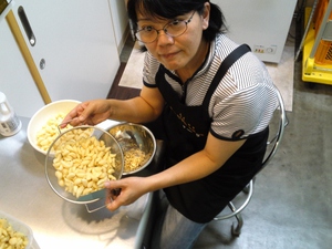 これを一つ一つ、手で剥いています。ミキサーにかけて、冷凍して、必要分を具材に混ぜて使っています。