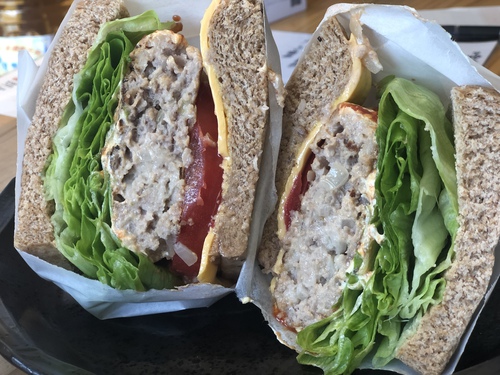 又吉アグー100%の手作りハンバーグ(160g)と野菜をたっぷり挟んだ、贅沢サンド❣️