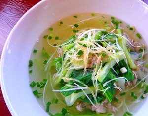 麵の上に、ザーサイと豚肉とシャキシャキちんげん菜、更に千切りの生姜がのっています。
