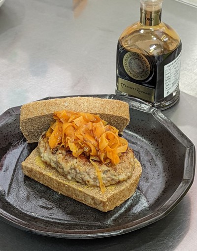 3.全粒粉パンをカット ⇒ 和からしをパンに塗る ⇒ アグーハンバーグを載せる ⇒ ハンバーグの上に炒めた人参を載せる ⇒ 人参にバルサミコ酢をかける
