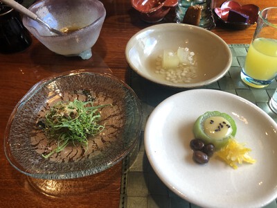 2.栄養価満点の長命草のサラダ(左下のガラス皿)