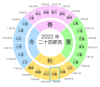 『白露(はくろ)とは、夜中に大気が冷え、草花や木に朝露が宿りはじめる頃。