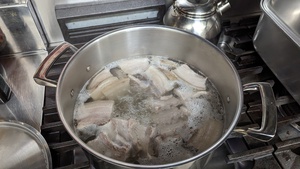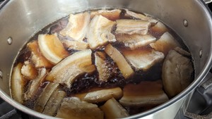3.黒糖、お醤油、生姜等を入れ弱火で煮込む